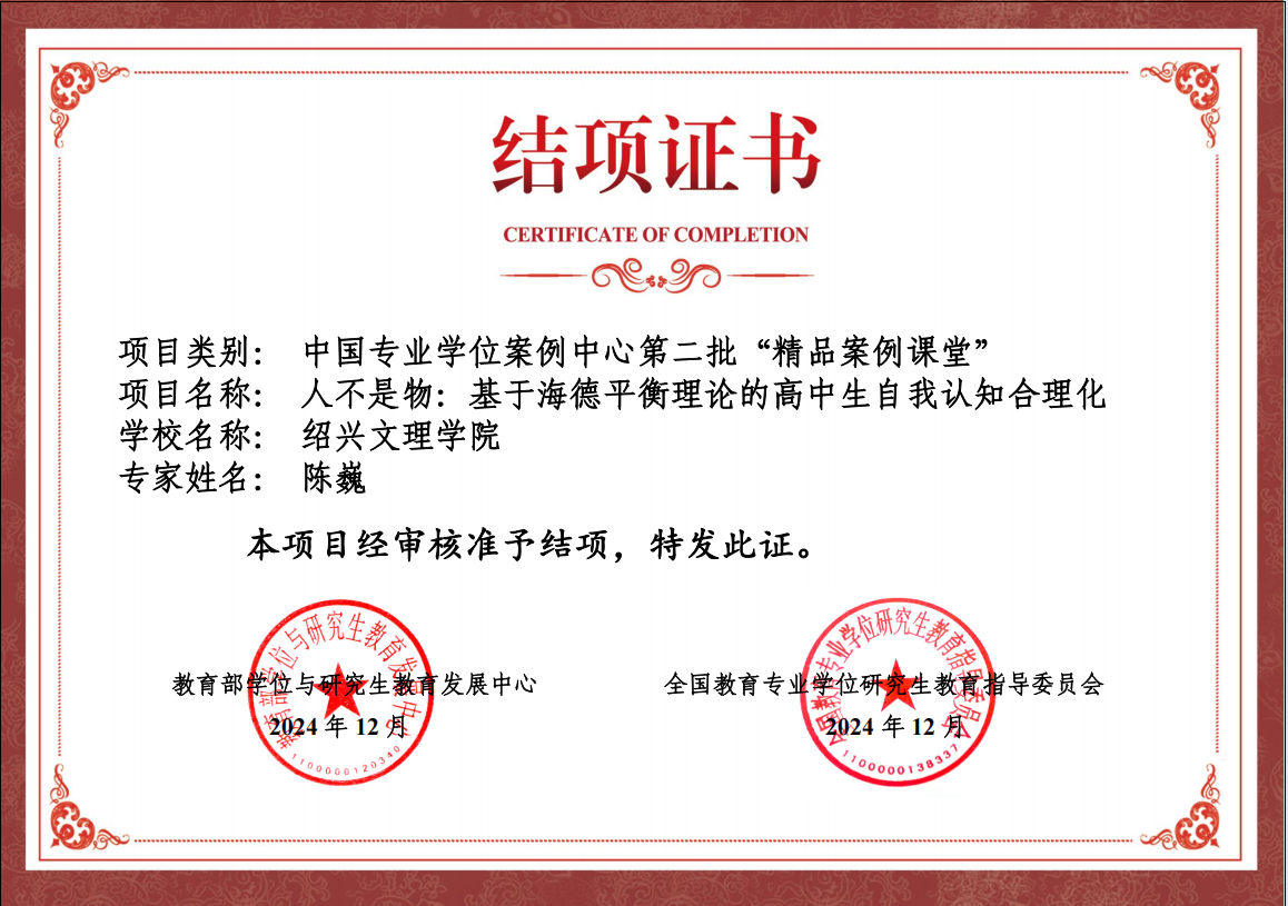 该项目由学校教育硕士学位点心作为受委托单位,陈巍作为首席专家,心理学系董达副研究员、绍兴市柯桥区豫才中学陈安娜老师等作为团队成员协力完成。案例基于海德平衡理论的视角,深入探析了高中生在学习与生活中的认知与心理问题,为高中生的自我认知发展与心理健康保持提供了有效的解决策略。本次全国共收录十个教育专业学位“精品案例课堂”。