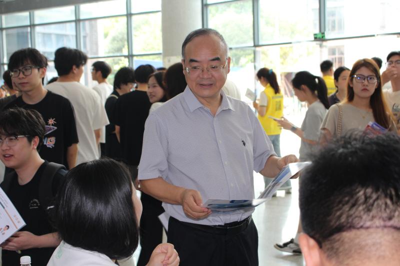 校党委副书记黄坚在招聘会现场实地指导。他指出,学校主动构建政校企三方联动模式,不仅能为学生高质量就业提供有力支撑,更能精准对接地方发展需求、为企业创新发展注入新鲜血液,实现多方共赢。
