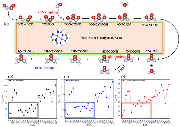图1. NO 与 CO偶联产尿素路径, 吸附能