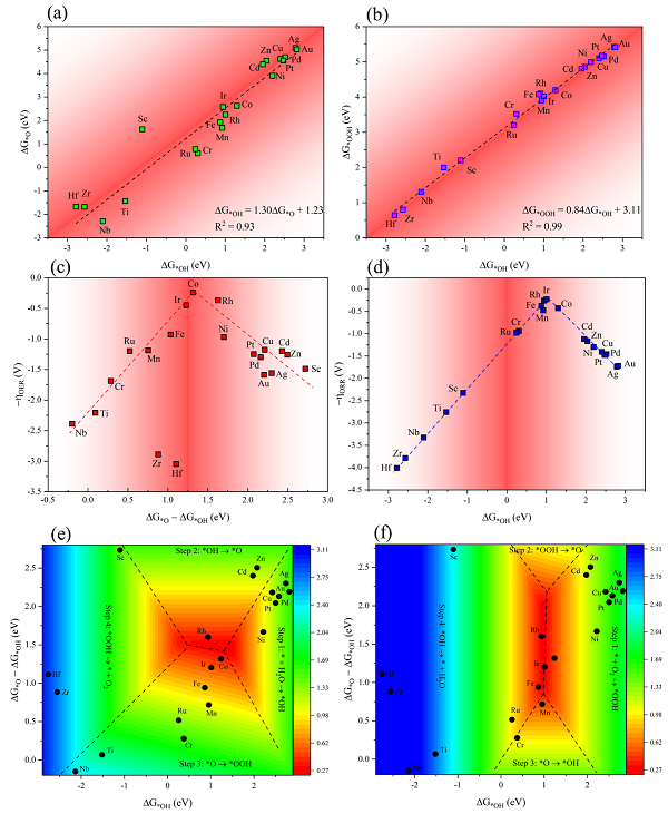 图2. OER/ORR 反应中间产物自由能变的标度关系, 过电位的火山图