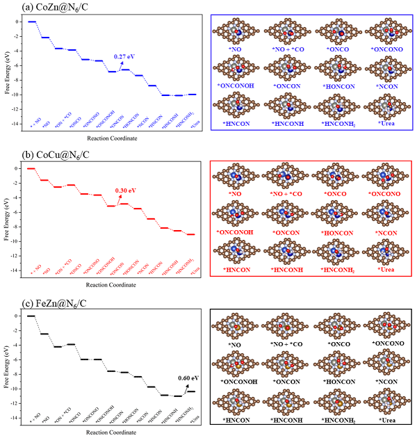 当前尿素是通过CO2NH3在高温高压条件下合成的, 这一过程不仅耗能极大且不环保。因此, 探索高性能的电催化剂在常温常压下用于尿素合成具有重要意义。在这个工作中, 基于密度泛函理论计算, 作者构建了一系列双原子催化剂, 以两种气体污染物(NO CO)作为N 源与C源进行C-N偶联产尿素。结果表明稳定吸附的NO CO 能够促进C-N 偶联以及连续的氢化反应。通过筛选, CoZn, CoCu, and FeZn@N6/C 催化剂能够持续的接受质子/电子对, 实现尿素的生成, 分别表现出−0.27, 0.30, 和 −0.60 V 的过电位。同时尿素产生是遵循 alternative 机制 。此外, 引入溶剂化效应与恒电势模型探索了在真实反应条件下C-N耦合动力学能垒, 只有0.75 eV。竞争性反应如HER NRR 也得到了很好的抑制。因此表现出产尿素的高选择性在这三种电催化剂上。