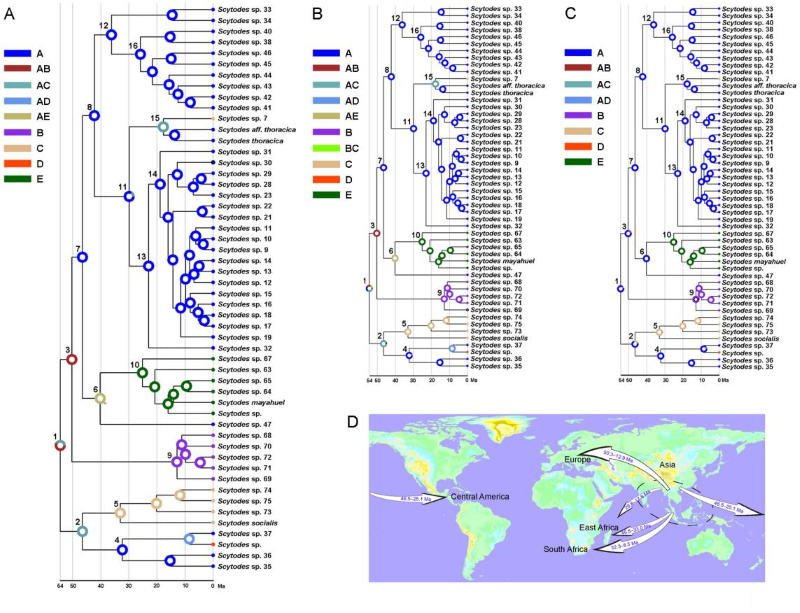 图3.全球唾蛛的生物地理重建