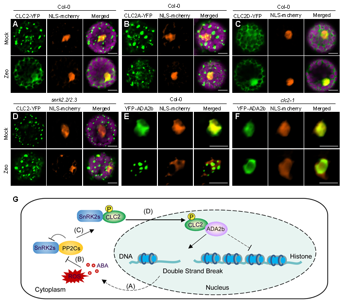 本研究发现,DNA损伤诱导CLC2进入细胞核(图 1A),且CLC2的入核依赖于蛋白激酶SnRK2.2/2.3对其S195和T196位点的磷酸化(图 1B-D)。此外,CLC2的入核促进了DNA损伤响应因子ADA2b在DNA损伤位点的精准定位(图 1E-F),进而参与DNA损伤修复过程(图 1G)。本研究成果即有助于拓展我们对网格蛋白功能的认知,又有助于完善植物DNA损伤修复调控的内在分子机理,对逆境条件下的作物产量和品质挖掘具有重要理论指导意义。