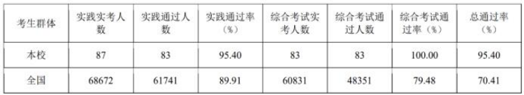我校共有87名全日制应届本科生参加考试,实践通过人数为83人,实践通过率为95.4%;综合考试实考人数83人,通过人数83人,综合考试通过率为100%;总通过率为95.4%,高于全国平均水平25个百分点,且比2021年总通过率提高了10个百分点。