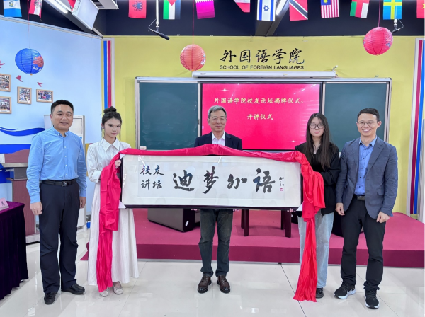 外国语学院与外国语学院校友会共同创建“迪梦外语”校友论坛。石国洪与学院院长胡朋志、吕志伟共同为校友论坛揭牌。