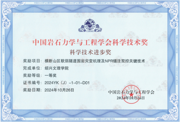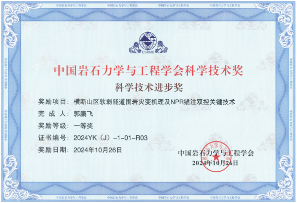 11月1-4日,第二十一次中国岩石力学与工程学术年会在成都举行,会议公布了2024年度中国岩石力学与工程学会各类科研奖项。我校作为第一完成单位,土木工程学院郭鹏飞副教授作为主要完成人的科研成果—“横断山区软弱隧道围岩灾变机理及NPR锚注双控关键技术”荣获科技进步奖一等奖。本次共评选出一等奖13项,其中自然科学奖一等奖4项、技术发明奖一等奖2项、科技进步奖一等奖7项。