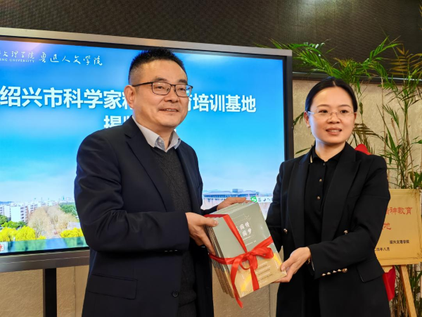 金晓兰代表绍兴市科协为学院赠送《家国情强国梦绍兴科学家精神故事》书籍,为学院师生进一步了解学习科学家精神提供资料支持。