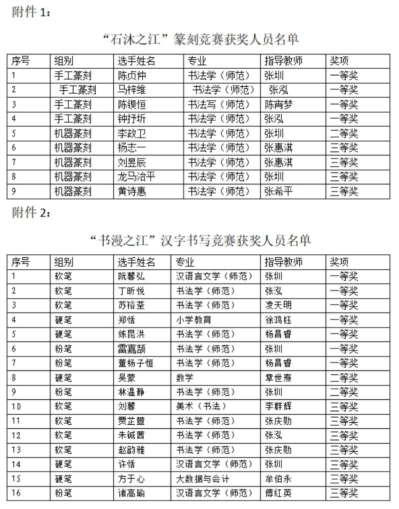 6月29日、30日,“典耀中华”主题读书活动暨浙江省第十三届大学生中华经典诵写讲大赛“书漫之江”汉字书写竞赛与“石沐之江”篆刻竞赛圆满落幕,我校共有30名选手参加,篆刻竞赛荣获一等奖4项、二等奖1项、三等奖4项,获奖比例高达90%;汉字书写竞赛荣获一等奖7项、二等奖2项、三等奖7项,获奖比例达80%。成绩居全省参赛高校之首,创同赛项我校赛史新高。两个赛项中获一等奖11名同学入围国赛。